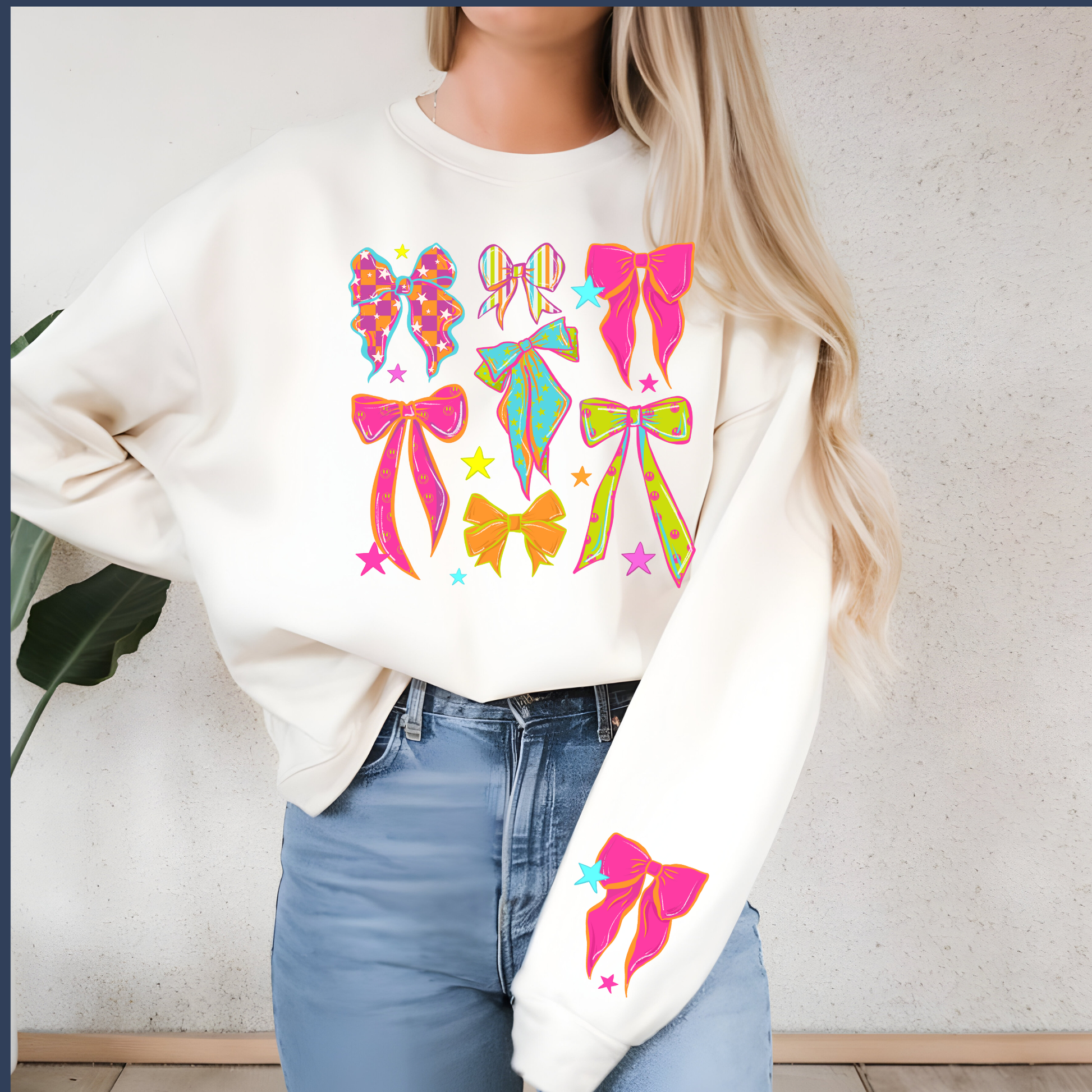 Add a pop of color and personality to everyday outfits with our Colorful Bow Sweatshirt, featuring a playful bow design and a coordinating sleeve accent that makes this piece extra special. It’s cute, cozy, and perfect for moms, teens, and kids who love a fun statement sweatshirt without sacrificing comfort.